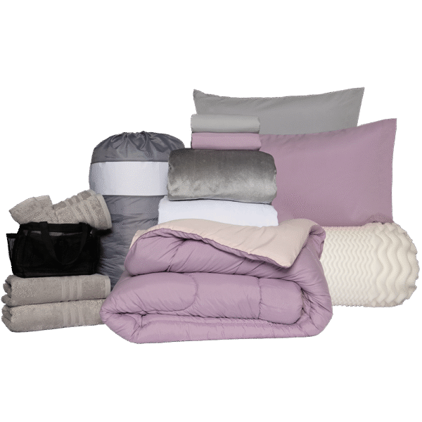 This pack includes an extra towel set, an extra pillow, an egg crate mattress topper to make your bed more comfortable, and a microplush blanket.
