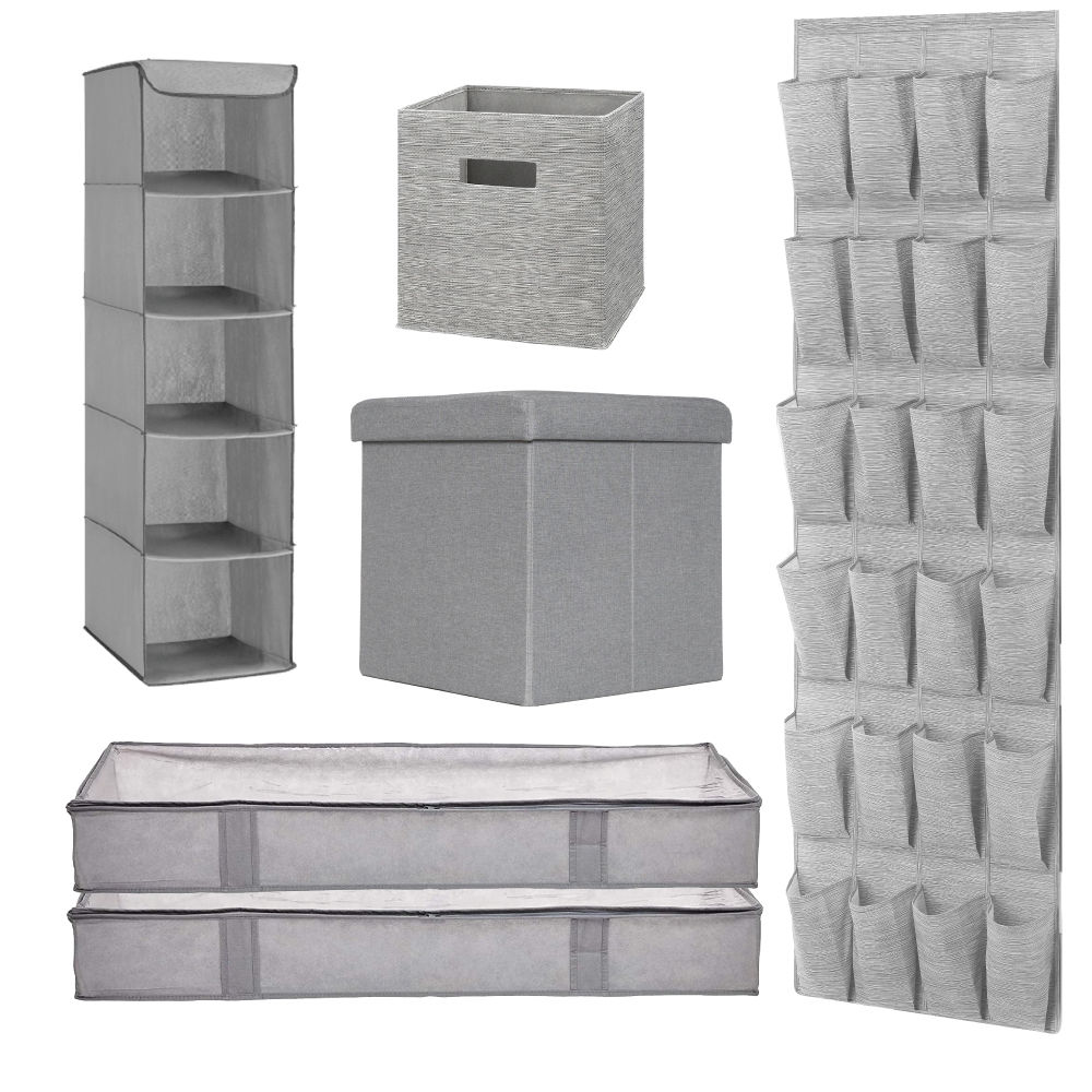 Stay organized in small spaces with smart storage solutions like a 5-section hanging shelf, a 20-pocket over-the-door organizer, and two underbed storage bags that keep clothes and linens neatly tucked away. A versatile fabric cube and collapsible storage ottoman add extra room for essentials while blending seamlessly into your space.